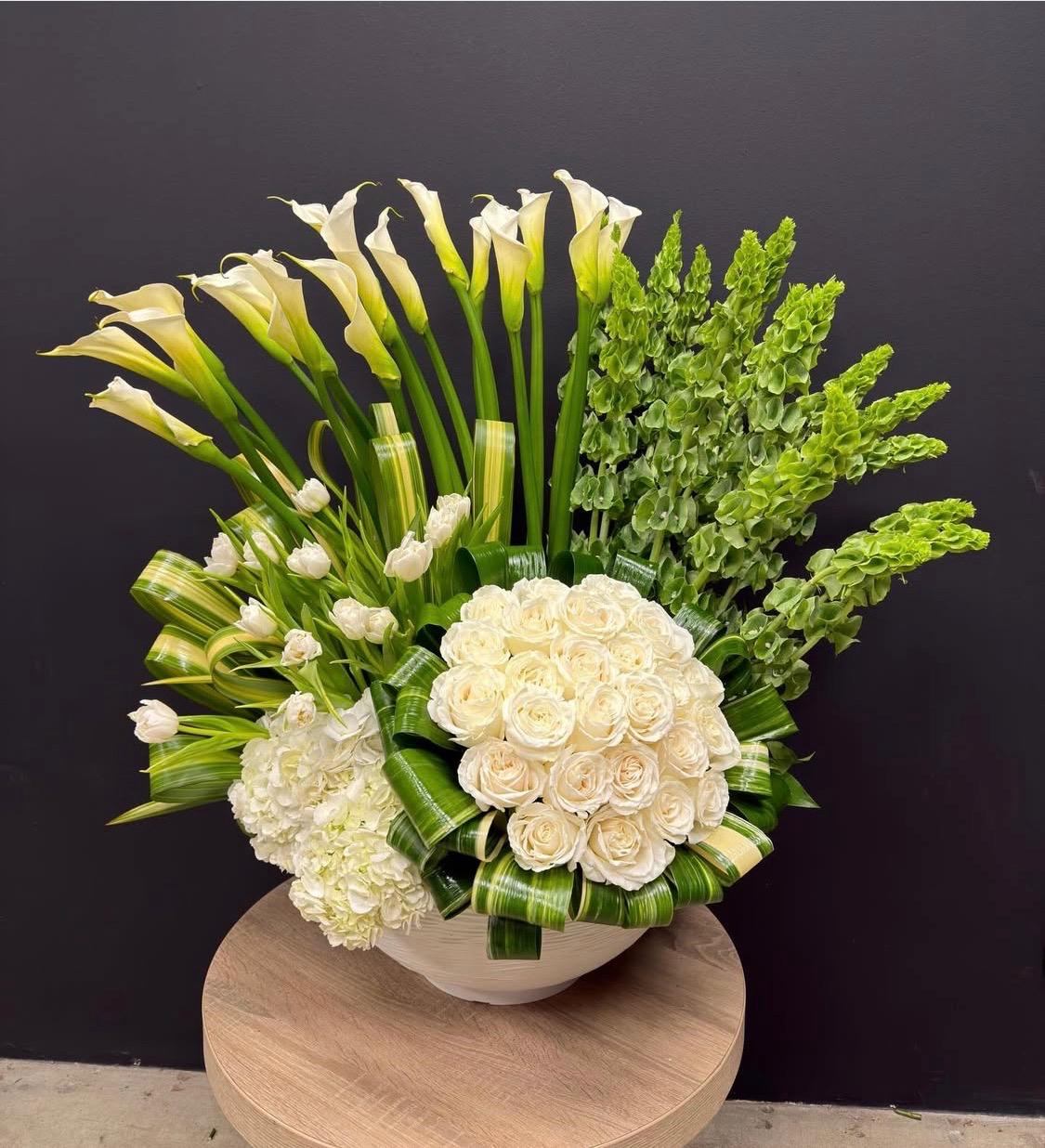 Bonito diseño de 15 alcatraz decena de tulipanes 24 rosas y Hortencia blanca en fina base .